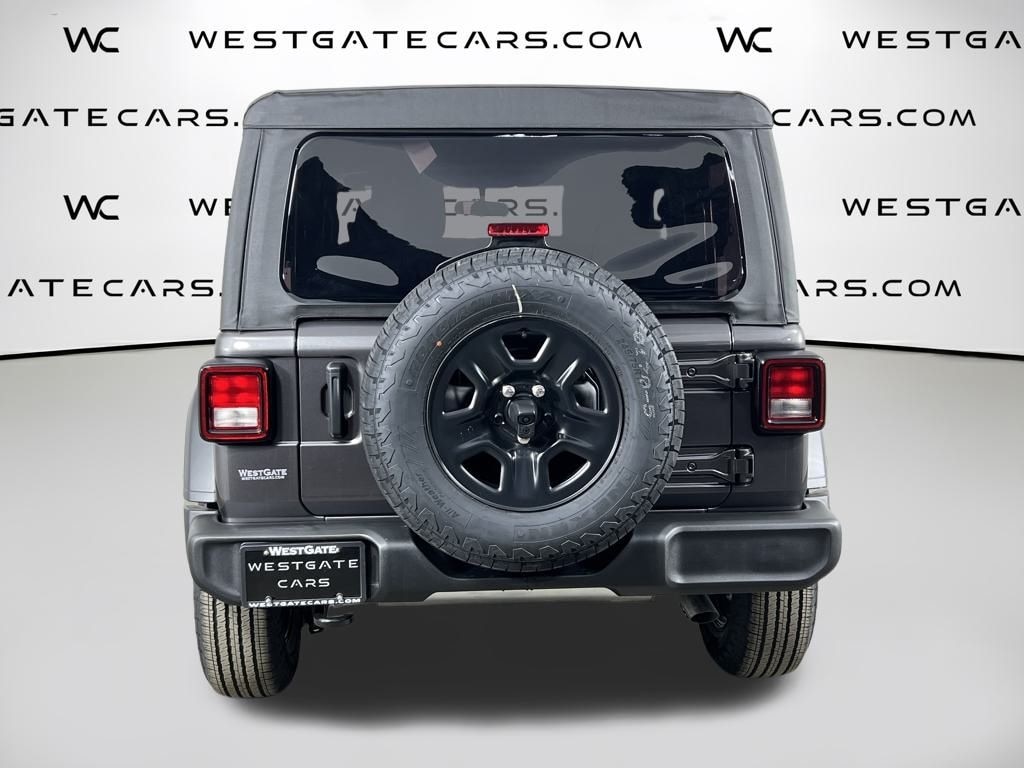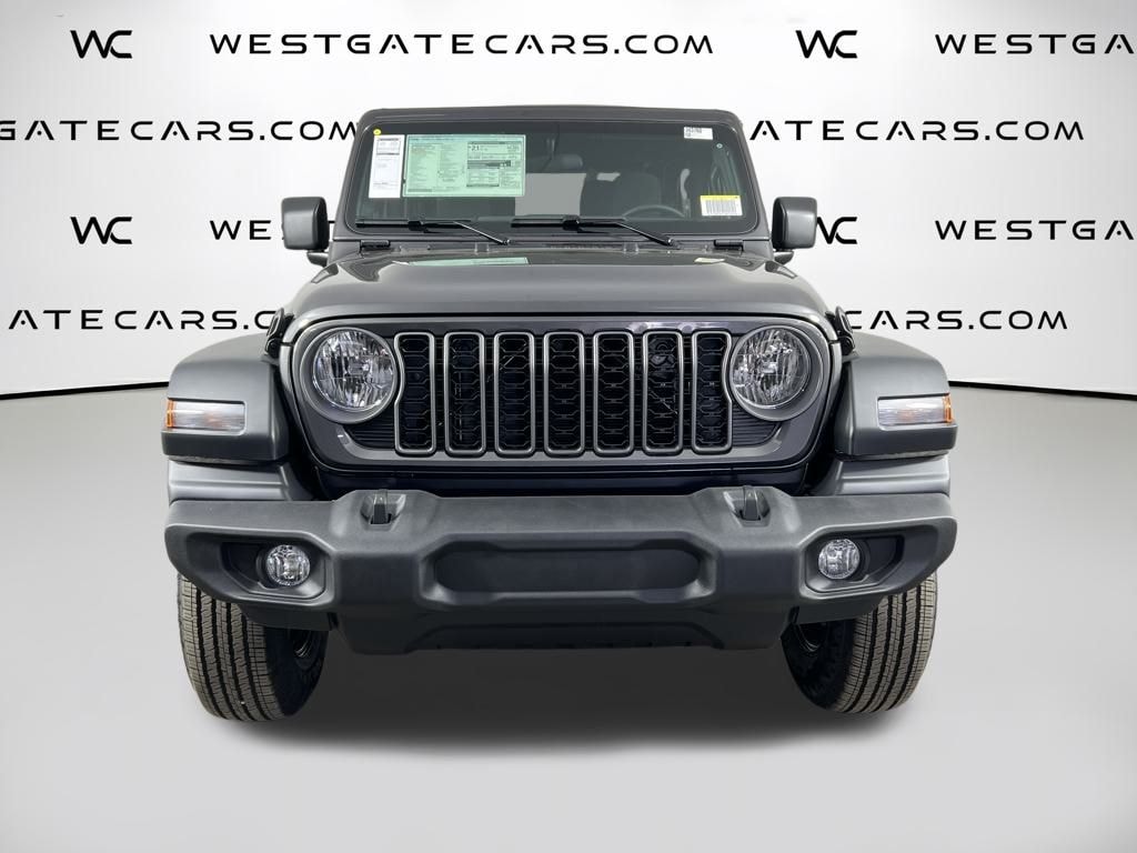 Dressed in a sleek Gray exterior, the Wrangler Sport boasts a rugged and distinctive style that commands attention. Its robust 17-inch Black Steel Styled wheels and deep tint sunscreen windows add to the vehicle's bold, adventurous presence. Inside, the Wrangler's well-appointed cabin features comfortable cloth low-back bucket seats, a 12.3-inch touchscreen display, and a host of advanced connectivity features, including Apple CarPlay, Android Auto, and 4G LTE Wi-Fi.