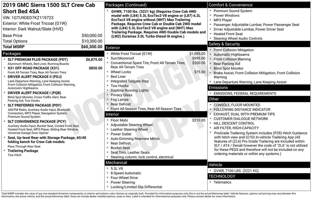 8-Speed Automatic, 4WD, Dark Walnut/Slate Leather, 12-Volt Rear Auxiliary Power Outlet, 120-Volt Bed Mounted Power Outlet, 120-Volt Instrument Panel Power Outlet, 170 Amp Alternator, 2 USB Ports, 2 USB Ports (1st Row), Auxiliary External Transmission Oil Cooler, Chrome Assist Steps, Chrome Grille, Color-Keyed Carpeting Floor Covering, Compass, Deep-Tinted Glass, Driver Alert Package I, Driver Alert Package II, Dual Exhaust w/Premium Tips, Electric Rear-Window Defogger, Electrical Lock Control Steering Column, Electronic Stability Control, Floor Mounted Console, Following Distance Indicator, Forward Collision Alert, Front Bucket Seats, Front Frame-Mounted Black Recovery Hooks, Front Pedestrian Braking, Fully automatic headlights, GMC 4G LTE, GMC Connected Access, HD Radio, Heated 2nd Row Outboard Seats, Heated Driver & Front Passenger Seating, Heavy-Duty Rear Locking Differential, High-Capacity Air Filter, Hill Descent Control, Hitch Guidance, Hitch Guidance w/Hitch View, In-Vehicle Trailering App, Integrated Trailer Brake Controller, IntelliBeam Automatic High Beam On/Off, Keyless Open & Start, Lane Change Alert w/Side Blind Zone Alert, Lane Keep Assist w/Lane Departure Warning, LED Cargo Area Lighting, Low Speed Forward Automatic Braking, Manual Tilt-Wheel & Telescoping Steering Column, Off-Road Suspension, OnStar & GMC Connected Services Capable, Perimeter Lighting, Power Door Locks, Power Front Passenger Windows w/Express Up/Down, Power Front Windows w/Driver Express Up/Down, Power Rear Windows w/Express Down, Power Sliding Rear Window w/Rear Defogger, Power Sunroof, Preferred Equipment Group 4SA, Premium Bose 7-Speaker Sound System, Radio: Premium GMC Infotainment Sys w/Navigation, Rear Cross Traffic Alert, Rear Dual USB Charging-Only Ports, Rear Wheelhouse Liners, Remote Vehicle Starter System, Safety Alert Seat, SiriusXM Radio, SLT Convenience Package, SLT Preferred Package, SLT Premium Plus Package, Spray-On Pickup Bed Liner w/GMC Logo, Steering Wheel Audio Controls, Theft Deterrent System (Unauthorized Entry), Trailer Tire Pressure Monitor System, Trailering Package, Ultrasonic Front & Rear Park Assist, Universal Home Remote, Ventilated Driver & Front Passenger Seats, Wireless Charging, X31 Hard Badge, X31 Off-Road Package, 10-Way Power Driver Seat Adjuster w/Lumbar, 10-Way Power Passenger Seat Adjuster w/Lumbar, 20" x 9" Polished Aluminum Wheels, 3.23 Rear Axle Ratio, 4-Wheel Disc Brakes, 6 Speakers, 6-Speaker Audio System Feature, ABS brakes, Air Conditioning, All-Weather Floor Liner (LPO), Alloy wheels, AM/FM radio: SiriusXM, Apple CarPlay/Android Auto, Auto-dimming door mirrors, Auto-dimming Rear-View mirror, Automatic temperature control, Brake assist, Bumpers: chrome, Delay-off headlights, Driver door bin, Driver Memory, Driver vanity mirror, Dual front impact airbags, Dual front side impact airbags, Front 40/20/40 Split-Bench Seat, Front anti-roll bar, Front Center Armrest w/Storage, Front dual zone A/C, Front fog lights, Front reading lights, Front wheel independent suspension, Heated door mirrors, Heated front seats, Heated steering wheel, Heavy Duty Suspension, Illuminated entry, Low tire pressure warning, Memory seat, Occupant sensing airbag, Outside temperature display, Overhead airbag, Overhead console, Panic alarm, Passenger door bin, Passenger vanity mirror, Perforated Leather-Appointed Seat Trim, Power door mirrors, Power driver seat, Power passenger seat, Power steering, Power windows, Premium audio system: GMC Infotainment System, Radio data system, Radio: Premium GMC Infotainment Sys w/Multi-Touch, Rear reading lights, Rear seat center armrest, Rear step bumper,